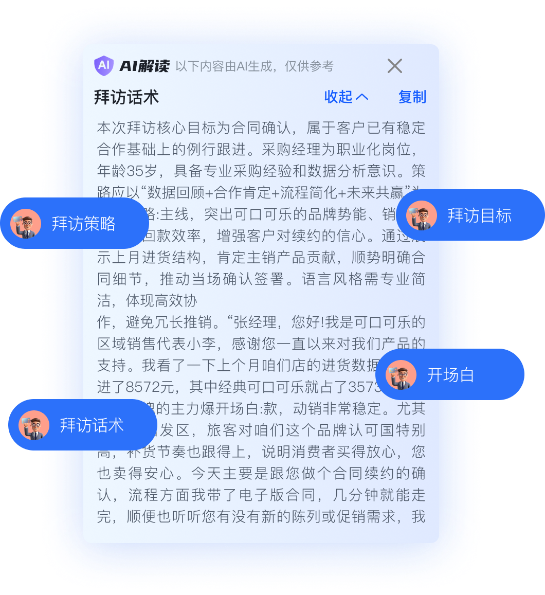 面对不同客户,如何开口才能瞬间抓住兴趣点?小陈不再依赖陈旧的话术本。她输入本次拜访的目标(推广新品、争取促销),AI即刻生成多套个性化沟通策略:“应对价格敏感型王经理:建议优先强调‘本品新品毛利空间高于竞品15%’,并突出‘限时返利’政策…若对方提及竞品:可采用‘人无我有’的对比策略,这是我们产品的三大独特优势…”这套量身定制的话术,融合了产品知识、竞争情报与消费心理学,让她还未见面,已握有锦囊妙计
