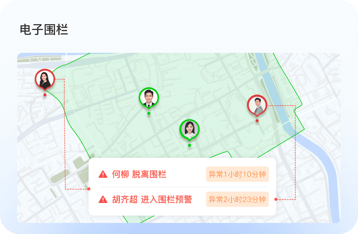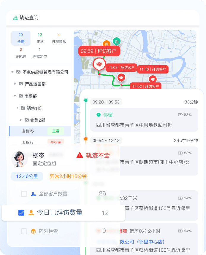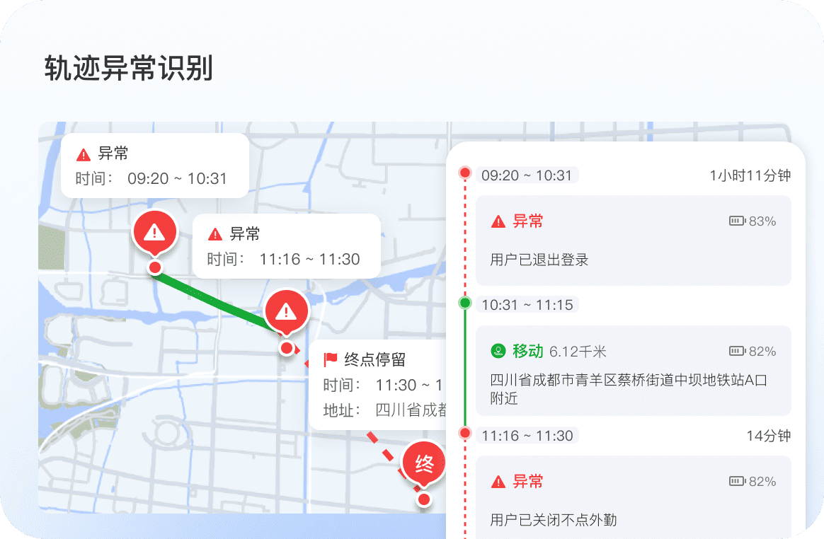 依托工作轨迹实时定位、电子围栏、轨迹异常识别,全程留痕杜绝外勤脱岗、假访漏访、路线偏离
