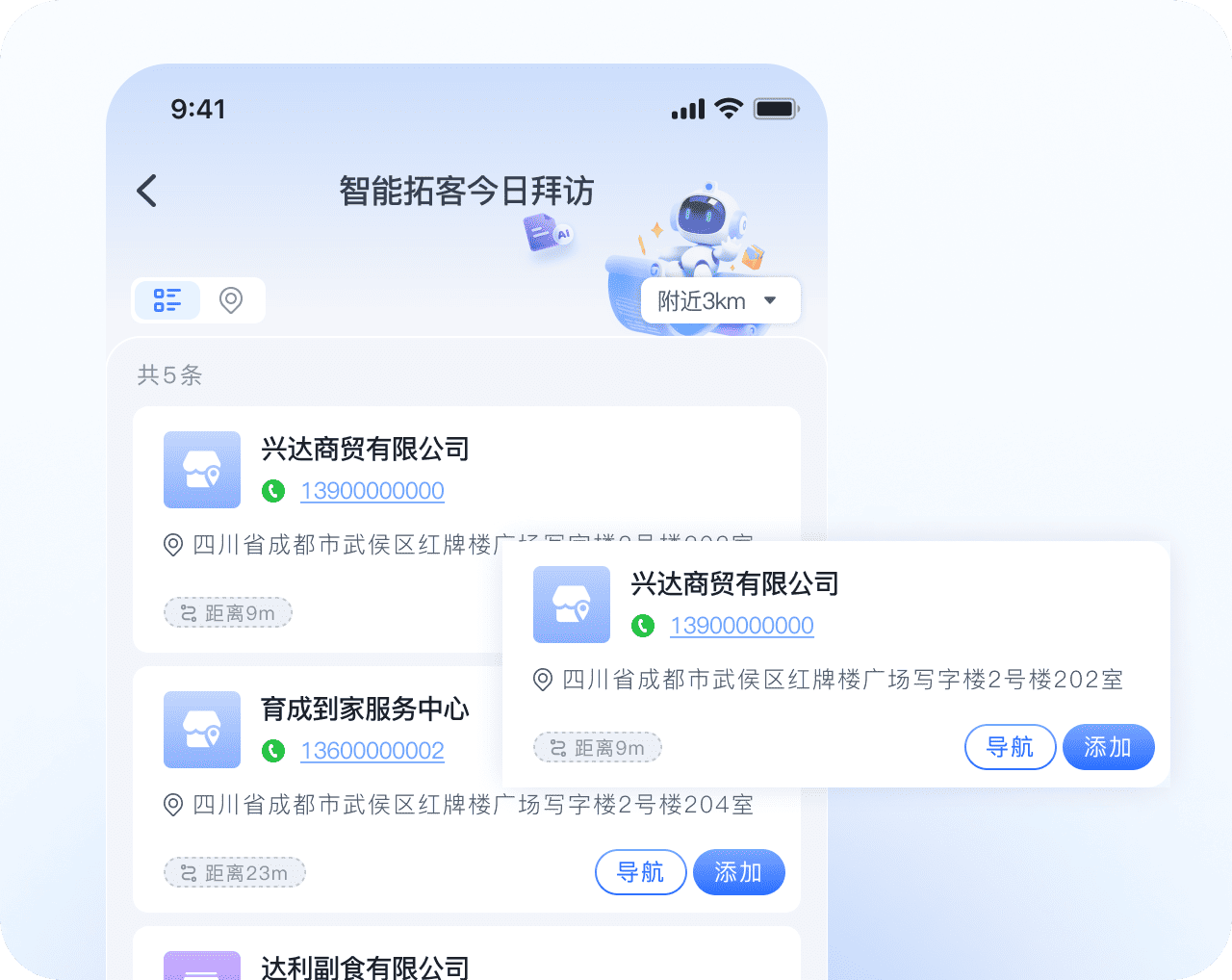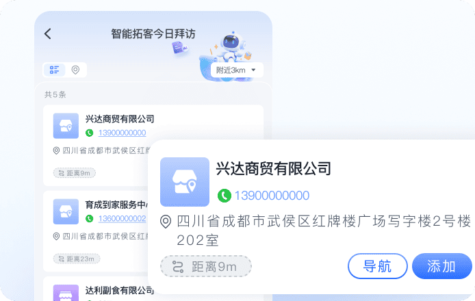 一键智能拓客,实时依据不同定位自动搜索附近潜客户,一键添加/拜访,降低拓客成本