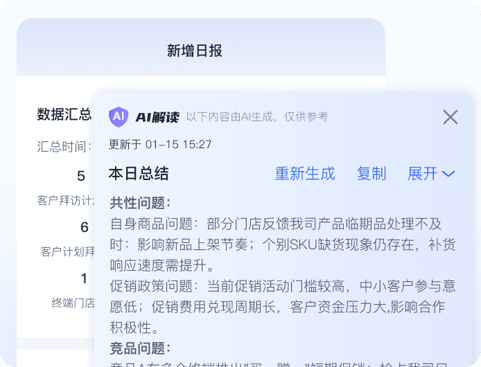 自动整合当日行程、拜访、任务完成情况,AI提炼工作重点;系统自动汇总工作数据,告别手工填写,让汇报回归“汇报”本身。