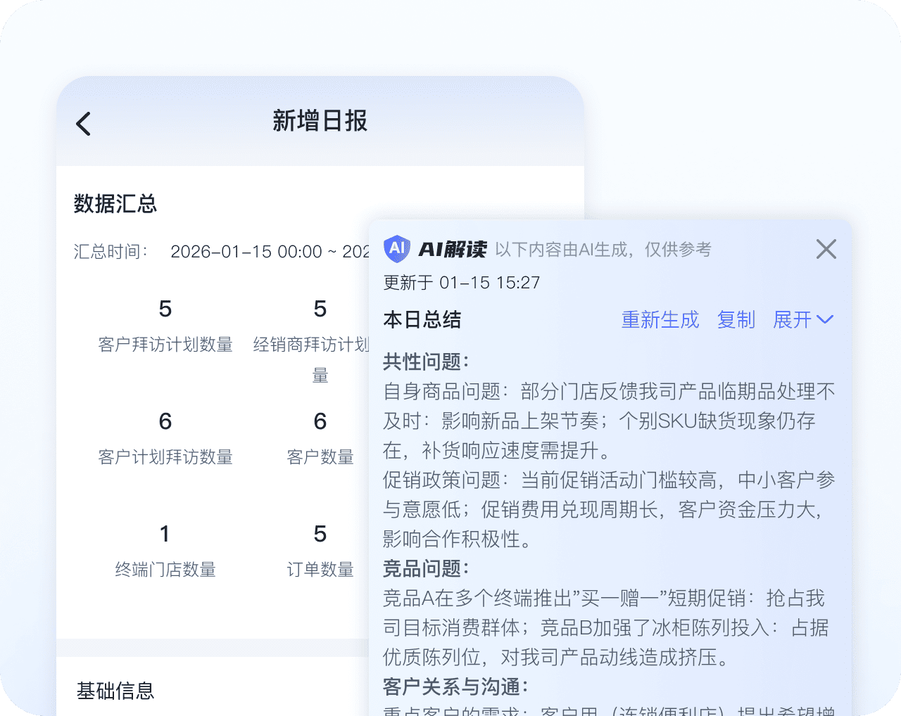 自动整合当日行程、拜访、任务完成情况,AI提炼工作重点;系统自动汇总工作数据,告别手工填写,让汇报回归“汇报”本身。
